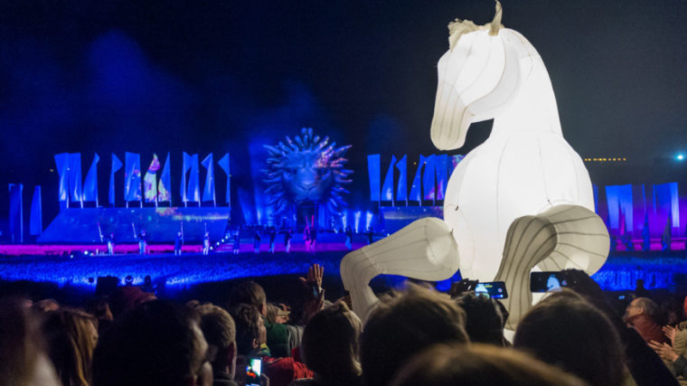 Etwa 300 Darsteller, um die 50 Pferde und 150 Künstler nahmen an der Eröffnungsshow teil, wie die belgische Nachrichtenagentur Belga am Freitag berichtete. Mit Feuerwerk, Lichteffekten und musikalischer Untermalung sollte die Inszenierung mit dem Titel «Inferno» den Veranstaltern zufolge ein «träumerische und poetische Welt» heraufbeschwören.