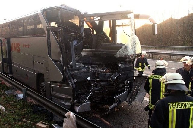 Insgesamt waren mehr als 40 Menschen im Bus. Nach Angaben eines Feuerwehrsprechers konnten sie alle das schwer beschädigte Fahrzeug alleine verlassen. Die gesamte Front des Busses war weggerissen.