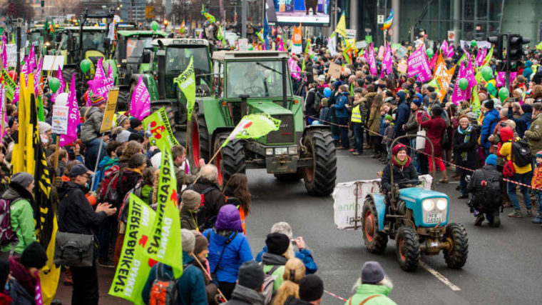 «Agrarkonzerne, Finger weg von unserem Essen» war ein zentraler Slogan der Kundgebung anlässlich der Landwirtschaftsmesse Grüne Woche, die am Freitag in der Hauptstadt begonnen hatte. Die Teilnehmer wandten sich gegen eine Industrialisierung der Landwirtschaft zu Lasten kleinerer Betriebe. Beteiligt waren sowohl ökologisch wie auch konventionell wirtschaftende Bauern und ihre Unterstützer.