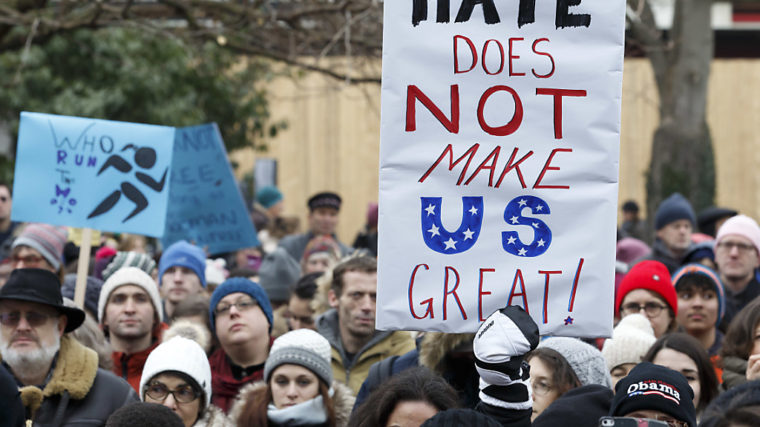 Der Protestmarsch führte bei eisigen Temperaturen von minus zwei Grad von einem Ufer entlang der Bucht zum anderen Ufer der Stadt Genf. Die Kundgebungsteilnehmenden trugen englischsprachige Plakate mit sich, unter anderem mit Parolen wie «Hass macht die USA nicht gross» oder «Widerstand ist eine Aufgabe, wenn die Ungerechtigkeit zum Gesetz wird».