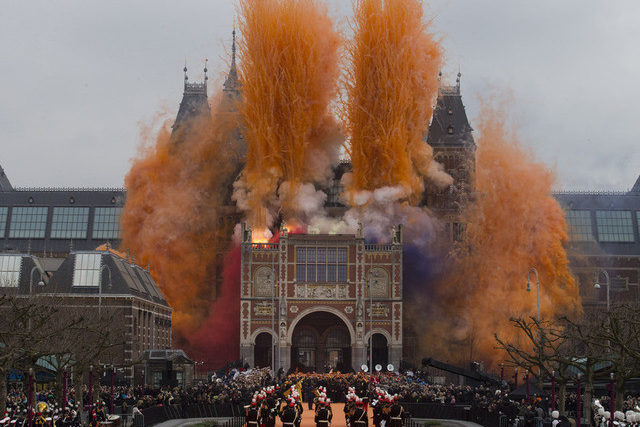 Vor dem Eingang drehte sie symbolisch einen Schlüssel um. Ein spektakuläres Feuerwerk hüllte daraufhin das Reichsmuseum in die Landesfarben Rot-Weiss-Blau und Orange.