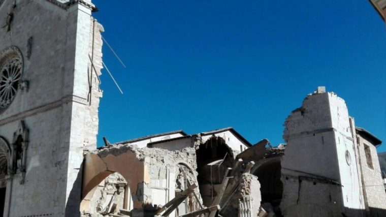 Die Basilika des Heiligen Benedikt wurde in den vergangenen Tagen abgesichert- nun blieb nach dem jüngsten Erdstoss nur die Fassade stehen, das Dach stürzte ein. Im übrigen Stadtgebiet ausserhalb der historischen Stadtmauer weisen viele Häuser grosse Risse auf – einige Anwohner versammelten sich in einem kleinen Park.