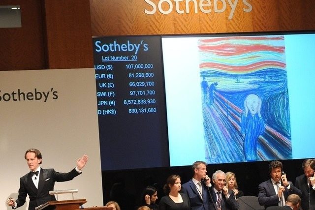 Die Arbeiter trugen Nachbildungen der schreienden Figur aus dem Rekordbild. In Sprechblasen standen Sätze wie „Sotheby’s beutet Arbeiter aus“.