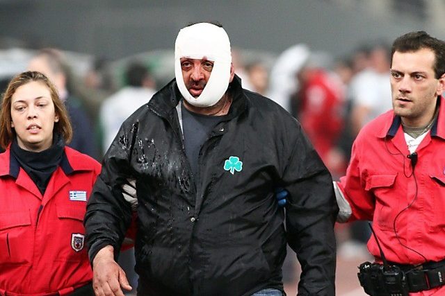 Nach dem 1:0 von Olympiakos durch Djamel Abdoun eskalierte die Situation erneut. Dutzende Molotow-Cocktails flogen auf Tribünen und dann auch auf das Spielfeld. Schiedsrichter, Spieler und Betreuer flüchteten in die Kabine. Mehrere Feuerwehrwagen fuhren in die Arena, um die Brände zu löschen. Rund um das Olympiastadion gingen die Zusammenstösse weiter, es waren Detonationen zu hören.