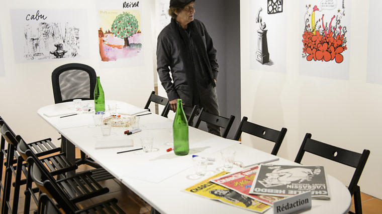 Die Schau «Relire Charlie Hebdo» ist gestaltet wie das Sitzungszimmer einer Redaktion: ein langer Tisch mit Schreibutensilien, Bürostühle und dahinter an den Wänden Arbeiten von Charb, Cabu, Luz, Willem, Wolinski, Riss, Catherine, Reiser, Gébé, Tignous und Honoré – von jedem vier bis sechs.