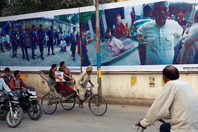 „On the Edge“ (Am Abgrund) hiess die Ausstellung, die auf einer Länge von 125 Metern entlang einer stark frequentierten Strasse montiert war. Die Bilder auf Werbeflächen von je 3 mal 6 Metern zeigten beispielsweise eine von Polizisten totgeprügelte Frau oder einen Mann, der bei der Rettung einer heiligen Kuh aus dem Ganges beinahe ertrinkt.