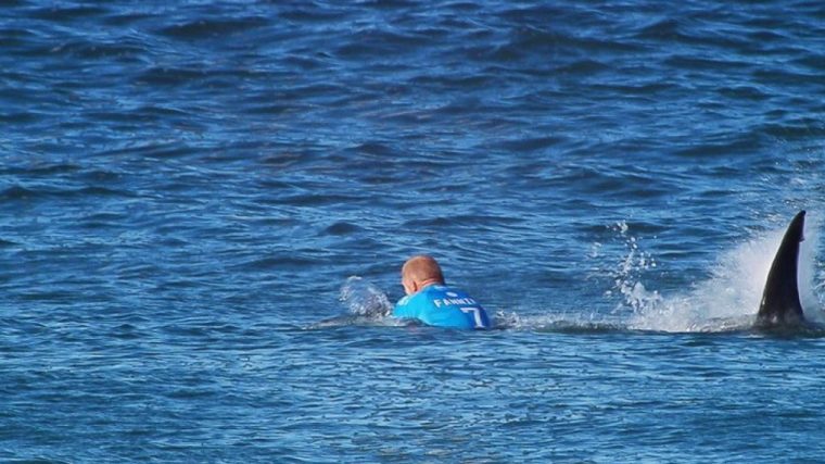 Auf dem Video ist zu sehen, wie Fanning während einer Veranstaltung im Rahmen der Surf-Weltmeisterschaft an der Jeffrey’s Bay nahe Port Elizabeth auf seinem Surfbrett sitzt, während sich in seinem Rücken eine typische Haiflosse nähert.