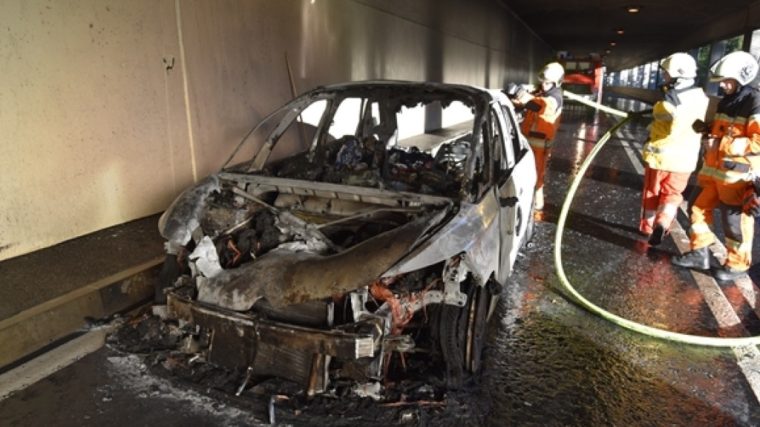 Der Lenker, der zu Hause in der Feuerwehr engagiert ist, griff nach einem Feuerlöscher an der Tunnelwand und versuchte, den Brand zu bekämpfen. Das gelang nicht: Der Wagen stand rasch in Vollbrand.