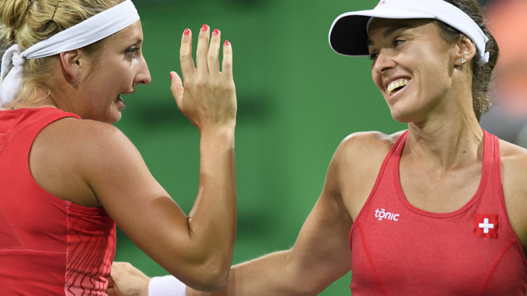 Timea Bacsinszky und Martina Hingis gewinnen nach 83 Minuten den Achtelfinal gegen das amerikanische Paar Bethanie Mattek-Sands/Coco Vandeweghe 6:4, 6:4 und stehen im Olympia-Viertelfinal.