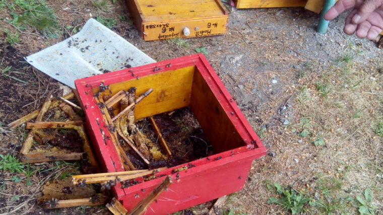 Er warf den Bienenstock von einer 60 Zentimeter hohen Plattform und holte sich daraus sechs Kilo Honig. Der Stock wurde stark beschädigt, der Bär verschwand ungesehen.