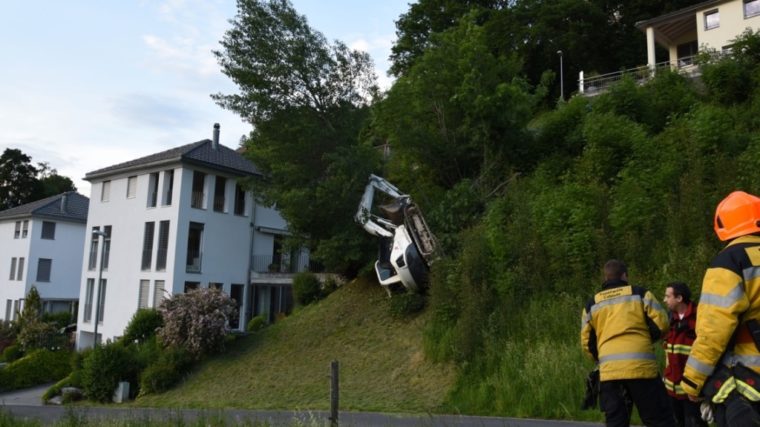 Neben einem Wohnhaus stürzte die Maschine 15 Meter einen steilen Abhang hinunter, wie die Polizei am Donnerstag mitteilte. Die Bergung dauerte bis in die Nachtstunden. An der Ladebrücke des Lastwagens entstand geringer, am Bagger beträchtlicher Sachschaden.