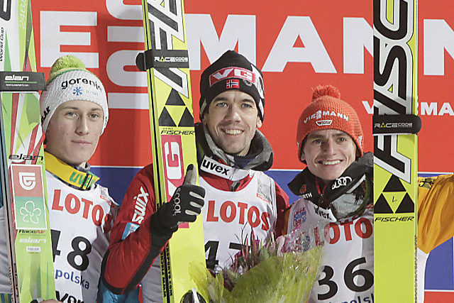 Bardal sowie Peter Prevc (Sln) und Richard Freitag (De), die mit dem Norweger aufs Podest stiegen, hatten mehr Glück als beispielsweise der Tourneesieger Thomas Diethart. Der Österreicher durfte ebenso wie Andreas Wellinger (De) ein zweites Mal springen, weil plötzlich stark einsetzender Regen die Anlaufspur verlangsamt hatte. Doch just zum Zeitpunkt der Sprungwiederholung am Ende des Feldes setzte der Regen wieder ein. Die beiden hatten keine Chance und mussten mit den Rängen 43 und 50 Vorlieb nehmen. Der erste Durchgang zog sich beinahe zwei Stunden in die Länge. Die Schweizer gingen in Polen nicht an den Start.