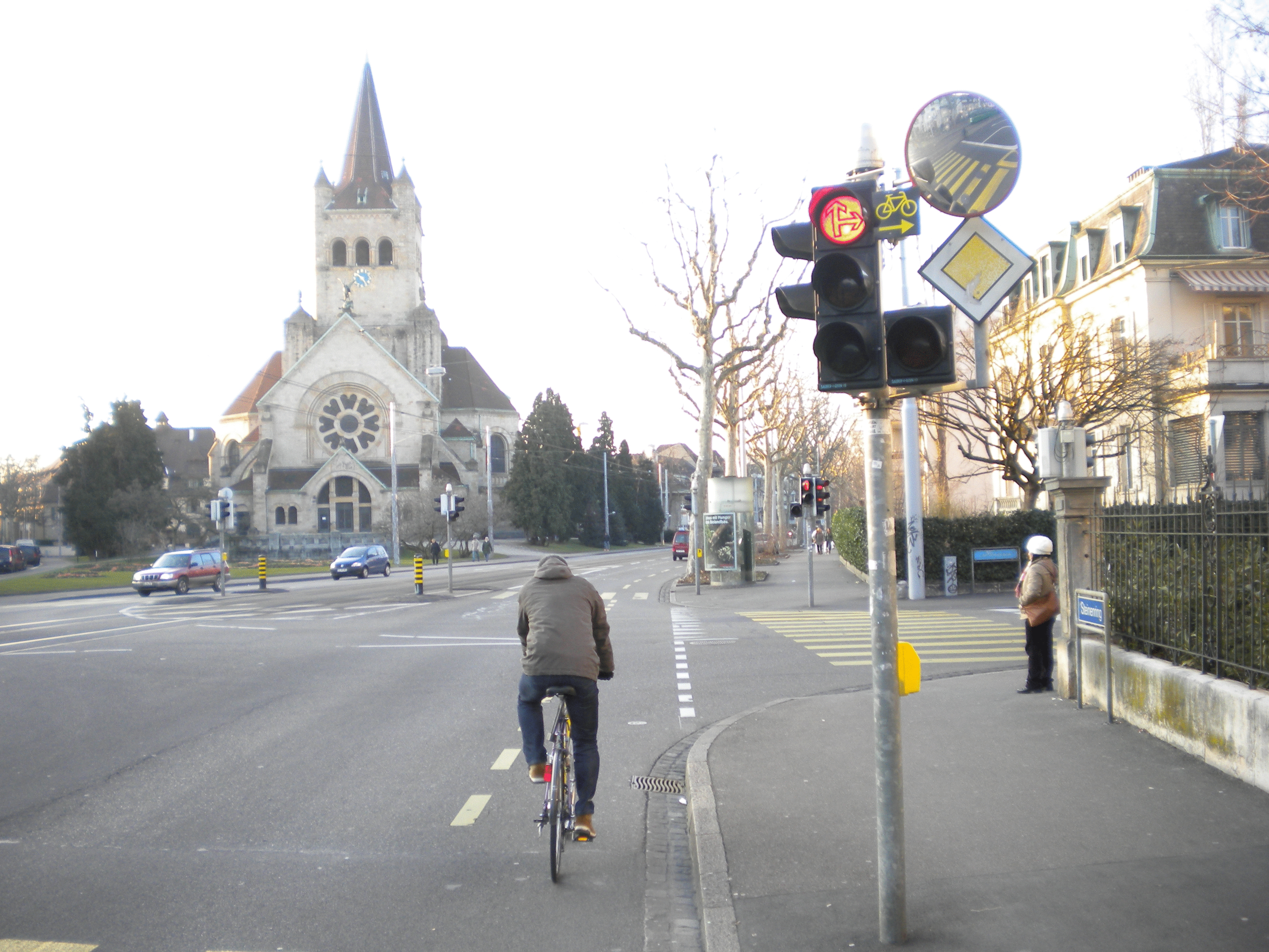 Der schweizweit beachtete Basler Pilotversuch läuft seit Mitte 2013 an drei Kreuzungen am Cityring. Sie sind mit einem besonderen Signal versehen, das ein gelbes Velo und einen Pfeil nach rechts auf schwarzem Grund zeigt (siehe Bild). An der Kreuzung Elsässer-/Mülhauserstrasse dürfen Velos geradeaus fahren, wenn Autos Rot und Fussgänger Grün haben.
