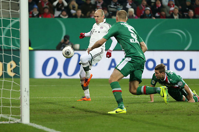Erstmals seit sieben Jahren steht wieder ein Bundesliga-Septett in den Cup-Viertelfinals. Bayern München setzt sich 2:0 beim FC Augsburg durch, muss aber den Ausfall von Arjen Robben verkraften.