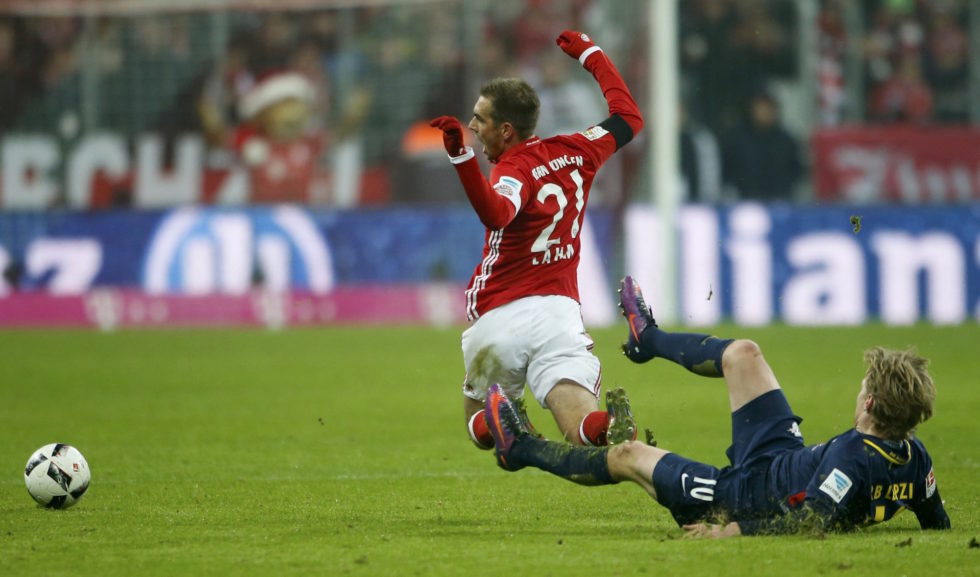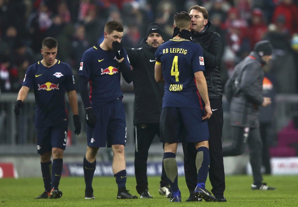 Ausgerechnet die Mittelfeldspieler Naby Keïta und Emil Forsberg, die beiden überragenden Individualisten des Aufsteigers in der Vorrunde, leisteten sich die entscheidenden Aussetzer. Keita, der angeschlagen in die Partie gegangen war, leitete mit einem Ballverlust das 0:2 durch Xabi Alonso ein (25.), der Schwede Forsberg, mit neun Assists der beste Vorbereiter der Liga, erwies seiner Mannschaft nach einer halben Stunde einen Bärendienst, als er einen Konter der Bayern mit einem Tritt in die Achillessehne von Philipp Lahm unterband und dafür zurecht die Rote Karte sah.