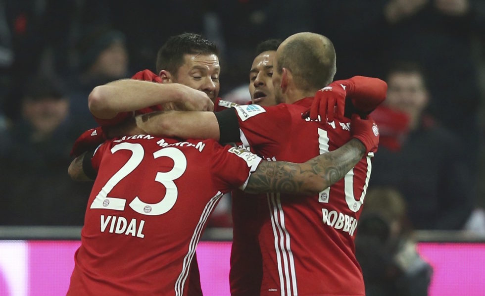 Eine herrliche Kombination über Arjen Robben, Lahm und Robert Lewandowski führte in der 17. Minute zum 1:0 durch Thiago. Nachdem Douglas Costa den zweiten Treffer bei seinem Pfostenschuss noch verpasst hatte (18.), erhöhte Alonso auf 2:0, ehe Lewandowski mit einem Foulpenalty und seinem 12. Saisontreffer kurz vor der Pause die Partie endgültig entschied.