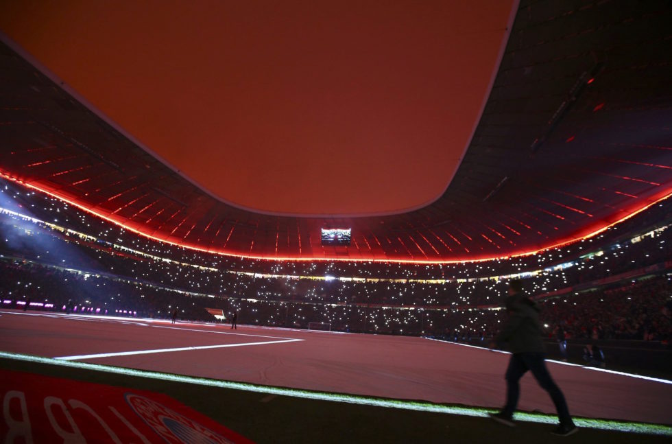 München leuchtet: Die Allianz-Arena in weihnachtlichem Rot nach dem Sieg im Spitzenspiel.