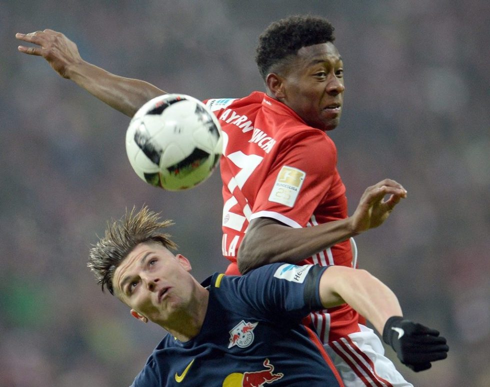 David Alaba, gerade mal wieder zu Österreichs Fussballer des Jahres gekürt, mit deutlicher Lufthoheit gegen den Leipziger Marcel Sabitzer.