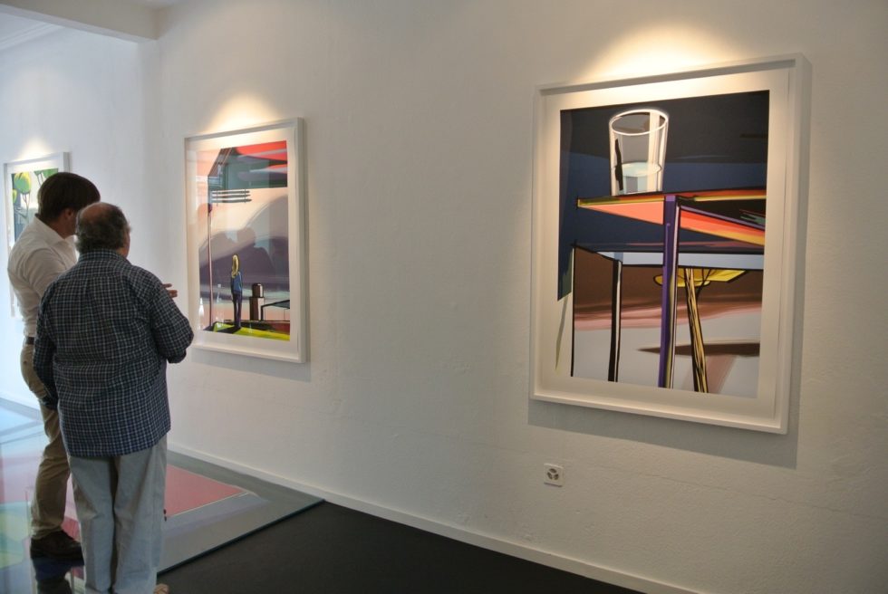 «Interiors» nennt Michael Meister die Serie von Bildern, die in der aktuellen Ausstellung in der Galerie Idea Fixa an der Feldbergstrasse 38 zu sehen sind. Es sind Digital Paintings, «gemalt» auf einem Computer-Tablet. Die deutlich hervorstechenden schwarzen Konturstriche und die starken Farbkontraste verleihen den Pigmentdrucken die Ästhetik von Comic-Bildern. Michael Meister verleugnet seine Herkunft als Illustrator (als das er auch in der TagesWoche des öftern bereits seine Spuren hinterlassen hat) also auch in seinen freien, künstlerischen Arbeiten nicht.