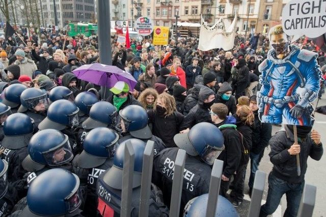 Diese hatten sich zunächst an der Paulskirche versammelt und gegen das «Krisenmanagement» in Europa demonstriert. Anschliessend ging der Demonstrationszug zum neuen EZB-Gebäude, das gerade bezogen wird. Die Demo stand unter dem Motto «Umzug zur neuen EZB – wir packen mit an!».