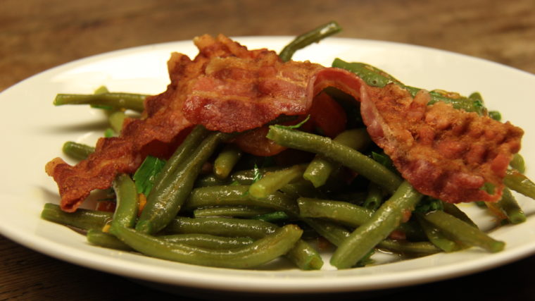 Ein halbes Kilo Bohnen rüsten und im Salzwasser bissfest kochen. Abschütten und kurz mit kaltem Wasser abschrecken. In der Zwischenzeit an zwei Tomaten den Stielansatz entfernen und die Tomaten in kochend heisses Wasser tauchen, bis sich die Haut löst. Herausnehmen und enthäuten. Die Tomaten halbieren und das Innere mit den Kernen vorsichtig entfernen. Die Tomaten in kleine Würfel schneiden, beiseite stellen. Eine Schalotte fein hacken. Etwas Peterli und Schnittlauch hacken. Eine Sauce anrühren mit etwas Salz, frisch gemahlenem Pfeffer und drei Esslöffeln Weissweinessig. Ein halbes Briefchen Safran oder einige Safranfäden oder beides dazugeben und mit dem Schwingbesen gut verrühren. Danach sechs Esslöffel bestes Olivenöl dazugeben, verrühren. Die Schalotten, Tomaten, Schnittlauch, Peterli und Bohnen in die Sauce geben, mischen und zum Durchziehen kurz stehen lassen. Mit gebratenen Speckscheiben garnieren.