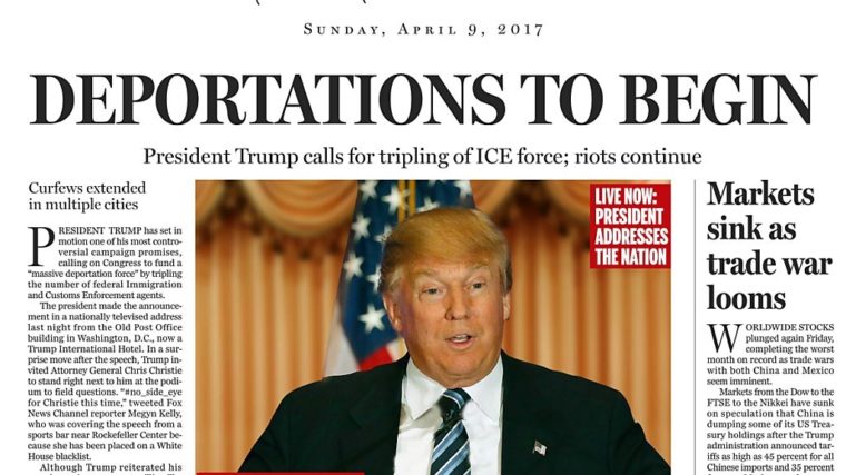 Mit einer fiktiven Frontseite hat die Zeitung «Boston Globe» simuliert, wie die Nachrichten am 9. April 2017 lauten könnten, wenn Donald Trump die US-Wahlen gewinnt und dann US-Präsident ist. Die Zeitung nahm den rechtspopulistische Milliardär beim Wort.