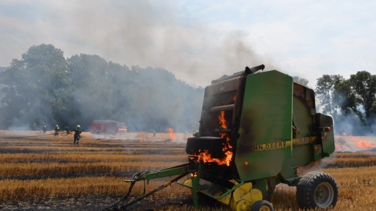 Die Strohballenpresse auf dem abgemähten Feld geriet am frühen Nachmittag in Brand. Ausgebrochen ist das Feuer im Pressraum. Die Flammen breiteten sich rasch aus. Dem Landwirt gelang es gemäss Polizei in letzter Minute, den Traktor von der Strohballenpresse zu lösen und in Sicherheit zu bringen.