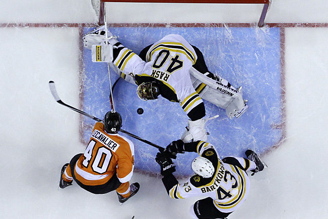 Die Flyers betrieben gegen Boston, das sich bereits für die Playoffs qualifiziert hat, viel Aufwand und lagen zweimal in Führung. Trotz letztlich 52:30 Schüssen auf das Tor mussten sie aber mit dem Erreichen der Verlängerung zufrieden sein. Das 3:3 schoss Vincent Lecavalier nämlich erst 25 Sekunden vor der Schlusssirene. Für den 33-jährigen Kanadier war es nach seinem 400. NHL-Tor, das ihm bereits im ersten Drittel gelungen war, der zweite Treffer des Abends. Im Penaltyschiessen entschieden Patrice Bergeron und Reilly Smith das Spiel zugunsten der Bruins, für Philadelphia traf einzig Claude Giroux. Für Boston war es der neunte Auswärtssieg in Serie (Klubrekord).
