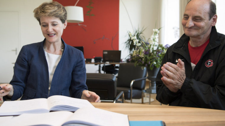 Bundesrätin Simonetta Sommaruga hat am Donnerstag in Bern das ehemalige Verdingkind Clément Wieilly getroffen. Wieilly legte in einer «Tour de Suisse für die Würde» rund 1800 Kilometer zu Fuss zurück. Das Treffen stand am Ende der Tour.