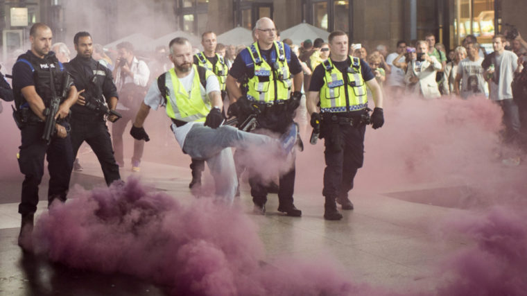 Ein Kordon mit rund einem Dutzend Polizisten hinderte die Demonstranten daran, in den abgesperrten Raum einzudringen. Die Polizei setzte dabei auch Reizstoff gegen die Randalierer ein. Fünf Personen aus der linksautonomen Szene wurden festgenommen.