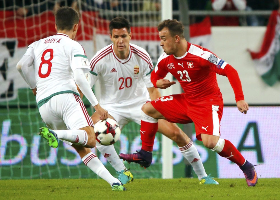 Xherdan Shaquiri im Duell mit Adam Nagy and Richard Guzmics.
