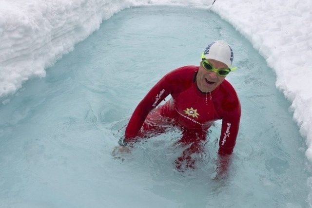 Bromeis setzte sich zum Start seiner 1230 Kilometer langen Rhein-Tour im Neoprenanzug in eine eigens für ihn aus dem Eis herausgehackte Badewanne. Danach ging es talabwärts auf Skiern Richtung Disentis, von wo aus der Wassermann schwimmend und teilweise zu Fuss Richtung Ziel unterwegs sein wird.