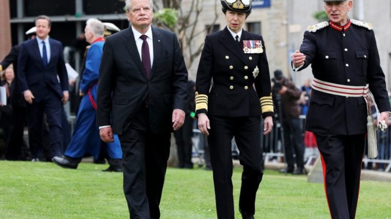 Gauck, Cameron und Prinzessin Anne besuchten in Kirkwall auf der Orkney-Insel Mainland einen feierlichen Gedenkgottesdienst. Die Gewässer rund um die Orkneys beherbergten im Ersten und Zweiten Weltkrieg den riesigen britischen Flottenstützpunkt von Scapa Flow.