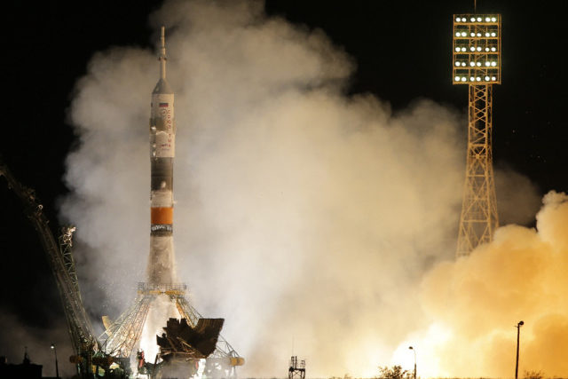 Vom Weltraumbahnhof Baikonur sind zwei russische Kosmonauten und ein US-amerikanischer Astronaut zur Internationalen Raumstation ISS gestartet. Die Trägerrakete hob wie geplant um 2.58 Uhr Ortszeit (22.58 MESZ) in der Ex-Sowjetrepublik Kasachstan ab.