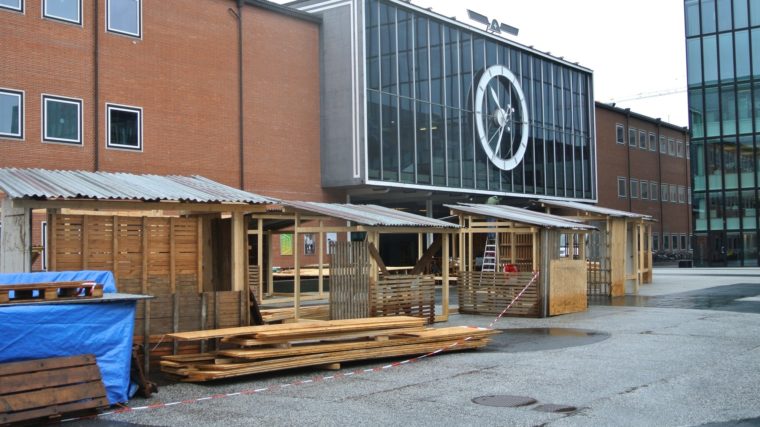 Wetterfest müssen sie schon sein, die Männer, die gegenwärtig auf dem Messeplatz rund um den Brunnen vor der Rundhofhalle mit Hammer, Nägeln, Sägen und sonstigem Werkzeug eine kleine Holzhüttensiedlung erstellen. Die Häuschenbauer wurden von den Verantwortlichen des Zwischennutzungsprojekts «Landestelle» auf dem Klybeckquai aufgeboten, welche die Hütten dereinst übernehmen werden.