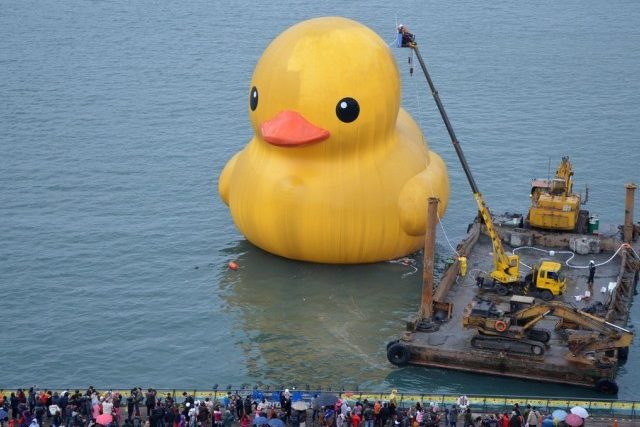Erneut ist einer Riesen-Gummiente des niederländischen Künstlers Florentijn Hofman in Taiwan die Luft ausgegangen. Nachdem eine Vorgängerin einem Erdbeben im November zum Opfer fiel, explodierte heute eine weitere 18 Meter hohe Version der klassischen gelben Badeente.