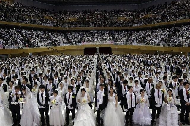 Die Massenhochzeiten der Sekte hatten in den 60er Jahren ihren Anfang genommen. Nahmen zu Beginn lediglich einige Dutzend Paare teil, stieg ihre Zahl über die Jahre rasant an. 1997 wurden in Washington 30’000 Paare auf einmal getraut, zwei Jahre später füllten 21’000 Paare das Olympiastadion in Seoul.