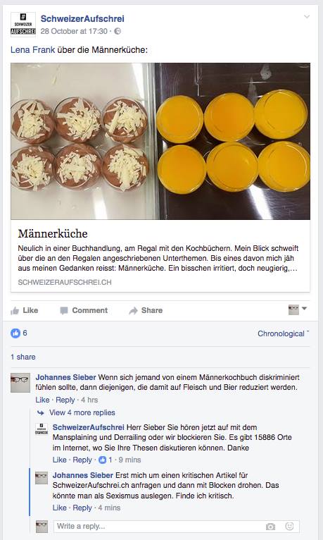 Ich habe gelernt, es heisse «Mansplaining», wenn ich den Standpunkt vertrete, dass ein «Männerkochbuch» höchstens denjenigen diskriminiere, dessen kulinarischer Horizont darin auf Fleisch und Bier reduziert wird. Dass ich darin beim besten Willen kein Indiz für ein strukturelles Machtgefüge zur Unterdrückung der Frauen erkennen kann, lenke vom Thema ab – und führte prompt zum Ausschluss aus der Online-Diskussion. Schade.