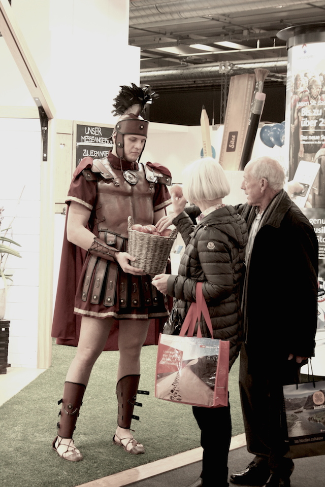 In besagtem Sektor kann man sich mit herrlich wohlriechendem Käsesorten, Würstchen und Zopf und «Späckbrötli» à gogo eindecken. Der Yoghurt aus dem Baselbiet, natürlich auch bio und alles, schmeckt uns am besten. Aber in erster Linie, hilft er die gefühlten Tonnen an «Niedletäfeli» und Magenbrot zu verdauen, die für haarsträubende Preise noch vor dem Messeeingang gekauft und gefuttert wurden, und um unsere Mägen zu neutralisieren. Doch Magen ist gerade das falsche Thema. Denn üble Backflashs tun sich auf; Erinnerungen an das Darm-Modell von vorher. Die müssen sofort wieder weg.