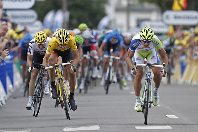Der erste Angreifer auf den letzten zwei Kilometer war Chavanel, doch zunächst der Thurgauer Michael Albasini und kurze Zeit später auch Cancellara schlossen die Lücke zum Franzosen. Der 31-jährige Berner fuhr danach gleich zu. Einzig Sagan und mit Mühe auch der Norweger Edvald Boasson Hagen konnten ihm folgen. Gegen den starken Sprinter aus Zilin, der sich schon den 14. Saisonsieg sicherte, besass Cancellara am Ende aber nicht den Hauch einer Chance. So kam Sagan, mit 22 Jahren der zweitjüngste Fahrer im 198-köpfigen Tour-Feld, bei seiner ersten Tour-de-France-Teilnahme auch gleich zum Premierensieg.
