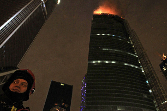 Aus den obersten Etagen des „Federazija“-Turms im Geschäftsviertel Moskwa City schlugen stundenlang hohe Flammen. Zwei Hubschrauber vom Typ Ka-32 nahmen immer wieder Wasser aus dem Fluss Moskwa im Stadtzentrum auf und warfen sie über dem Hochhaus ab.