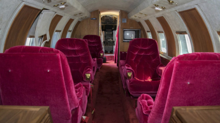 Die Sitze der luxuriös ausgestatteten Kabine der Lockheed Jetstar sind mit rotem Samt bezogen, auch die Toilette verfügt über eine Armlehne aus Samt. Mikrowelle und Fernseher im Original-Vintage-Look fehlen nicht, die Triebwerke dagegen schon.