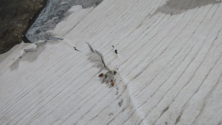 Einer der Bergretter wurde zur Verunglückten in die schmale Gletscherspalte hinunter gelassen, um sie zu sichern. Gemäss Rega war dies angesichts der Enge und der Dunkelheit kein einfaches Unterfangen. Die Frau wurde mittels eines Dreieck-Stativs mit Seilen und einem Elektromotor in die Höhe gehisst. Sie wurde mittelschwer verletzt ins Regionalspital Lugano geflogen.