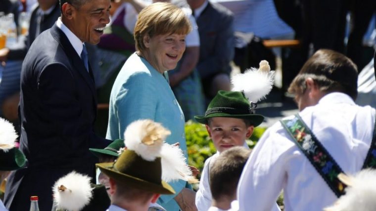 Kurz vor Beginn des Treffens demonstrierten Merkel und Obama der Spähaffäre um den US-Geheimdienst NSA und den BND zum Trotz bei einem Besuch in dem oberbayerischen Dorf Krün demonstrativ Geschlossenheit: Nachdem am Vorabend ein heftiges Gewitter die Gegner des Gipfels noch gezwungen hatte, ihr nahe gelegenes Protestcamp zu räumen, wurden die Kanzlerin und der US-Präsident in Krün bei blauem Himmel und strahlender Sonne zu Blasmusik, Bier und Weisswurst empfangen.