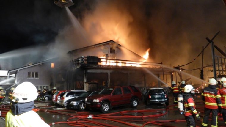 Einer der beiden an dem Auto arbeitenden Männer schlug kurz nach 19 Uhr Alarm. Als die Feuerwehr eintraf, stand die Liegenschaft bereits in Vollbrand. Die Löscharbeiten gestalteten sich aufwändig, da das Feuer immer wieder neue Nahrung fand und erneut aufflammte.