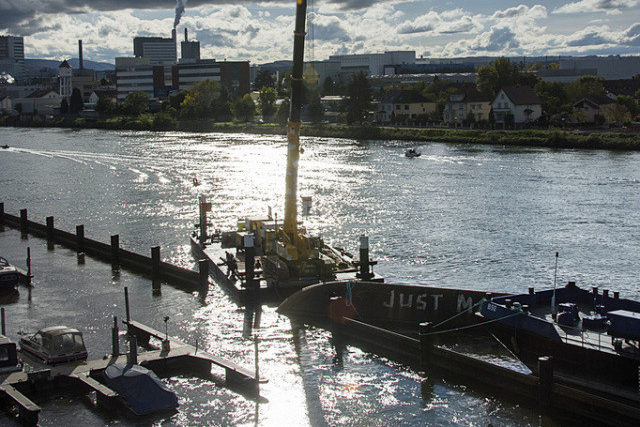 Am Montag kam das Bergungsteam dann deutlich vorwärts: Der flache Schiffsboden – er war schon bald nach der Havarie mit einem Graffity verziert worden – sei kaum mehr zu sehen, sagte ein Sprecher der Schweizerischen Rheinhäfen am Nachmittag erleichtert: Man sei inzwischen klar «über den toten Punkt» der Drehung hinaus gekommen.