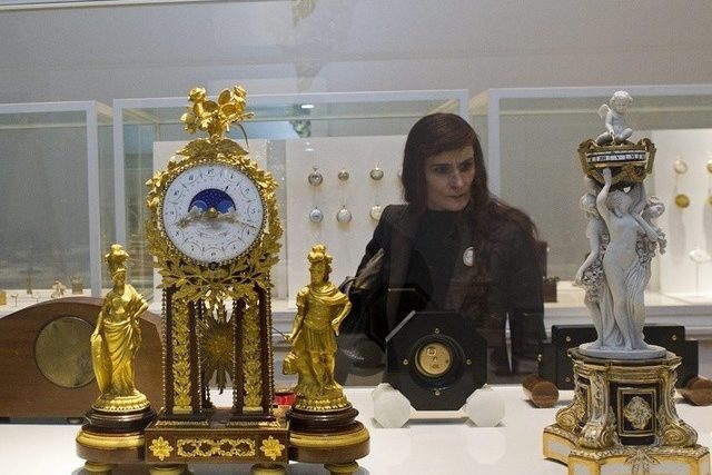 In der Ausstellung werden Highlights wie ein Vogelkäfig mit mechanischen Singvögeln gezeigt; die Uhr aus Gold, Emaille und Diamanten wurde etwa 1815 in Genf hergestellt.