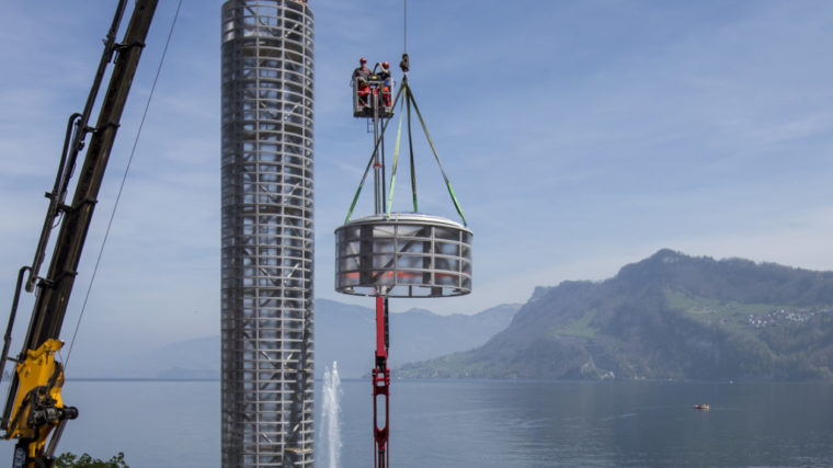 Der Glashersteller Glasi Hergiswil baut sich zu seinem 200. Firmenjubiläum ein Denkmal in Form eines 20 Meter hohen Glasturmes. Am Mittwoch sind die rund 700 Glasplatten, aus denen die Fassade besteht, montiert worden.