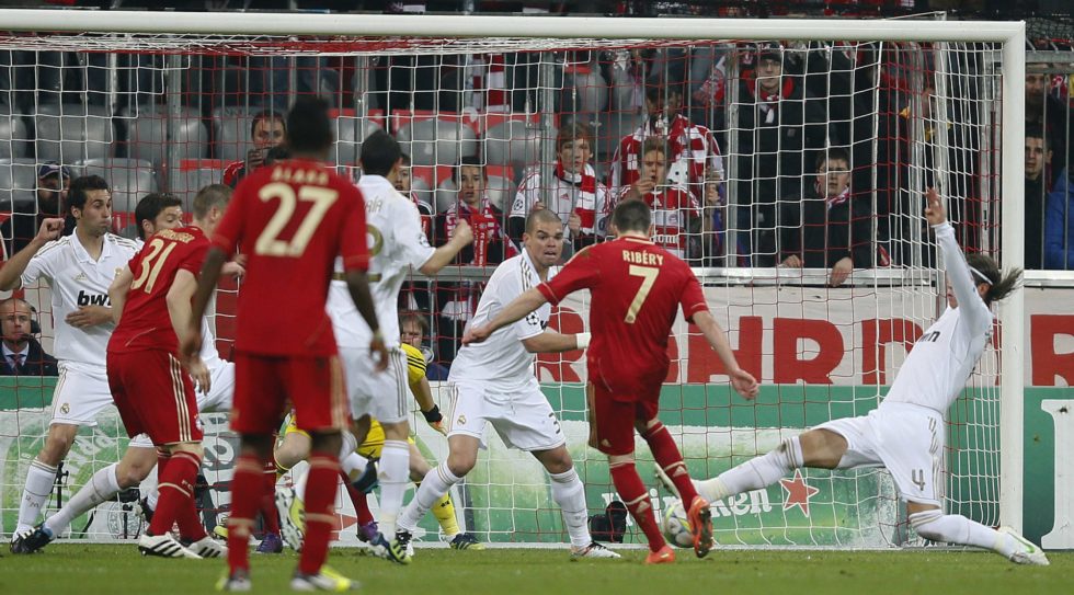 Zupass kam ihnen, dass gleich die erste Tormöglichkeit zum 1:0 führte: Ein Corner von Toni Kroos fand den Weg via Sergio Ramos und dem Oberarm von Holger Badstuber zu Franck Ribéry, der aus elf Metern kurz entschlossen abdrückte und flach ins Netz traf. Der Franzose bekundete indes einiges Glück, dass der Treffer anerkannt wurde, weil sein Teamkollege Luiz Gustavo vor Real-Goalie Iker Casillas im passiven Abseits gestanden und diesem leicht die Sicht verdeckt hatte.