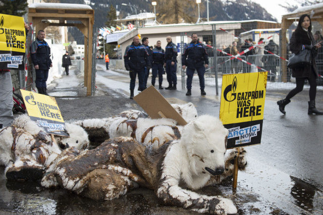 Um den Teilnehmern des Weltwirtschaftsforums die Auswirkungen einer allfälligen Ölpest in der Arktis vor Augen zu führen, haben sich Greenpeace-Aktivisten am Donnerstag als Eisbären verkleidet. Die Arktis-Bewohner «verendeten» dann in einer schwarzen Brühe.